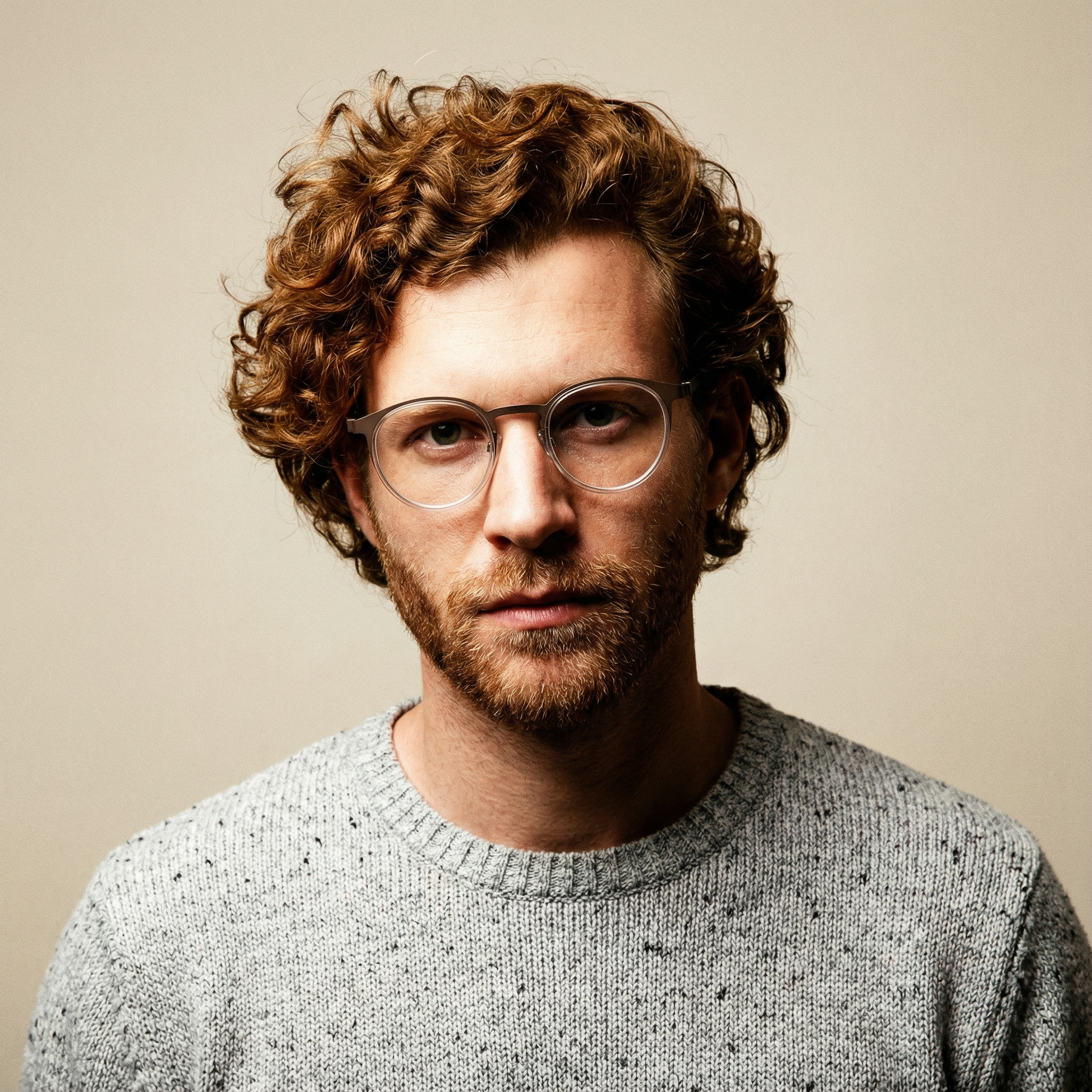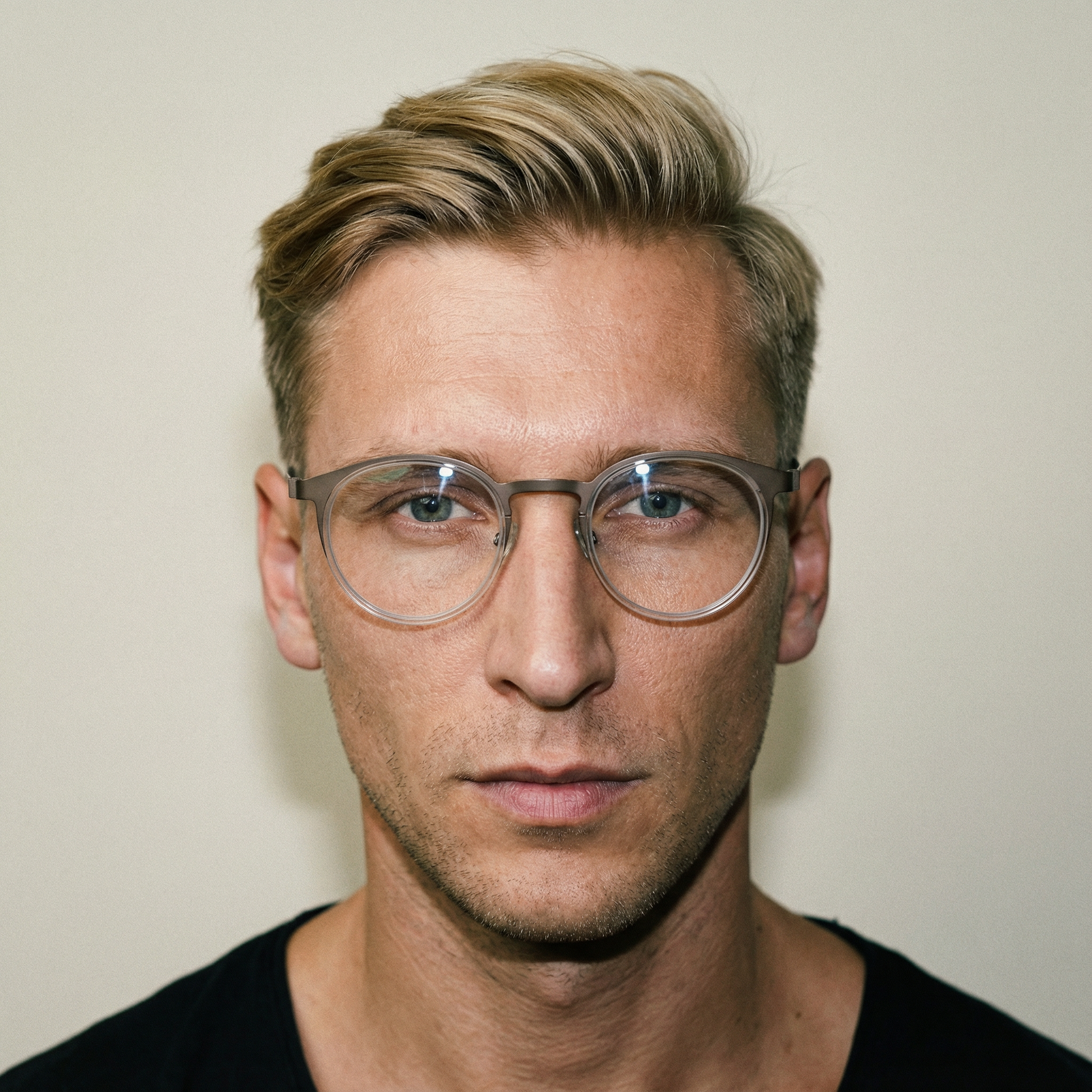 Close-up of a person wearing gold-rimmed glasses on a plain background