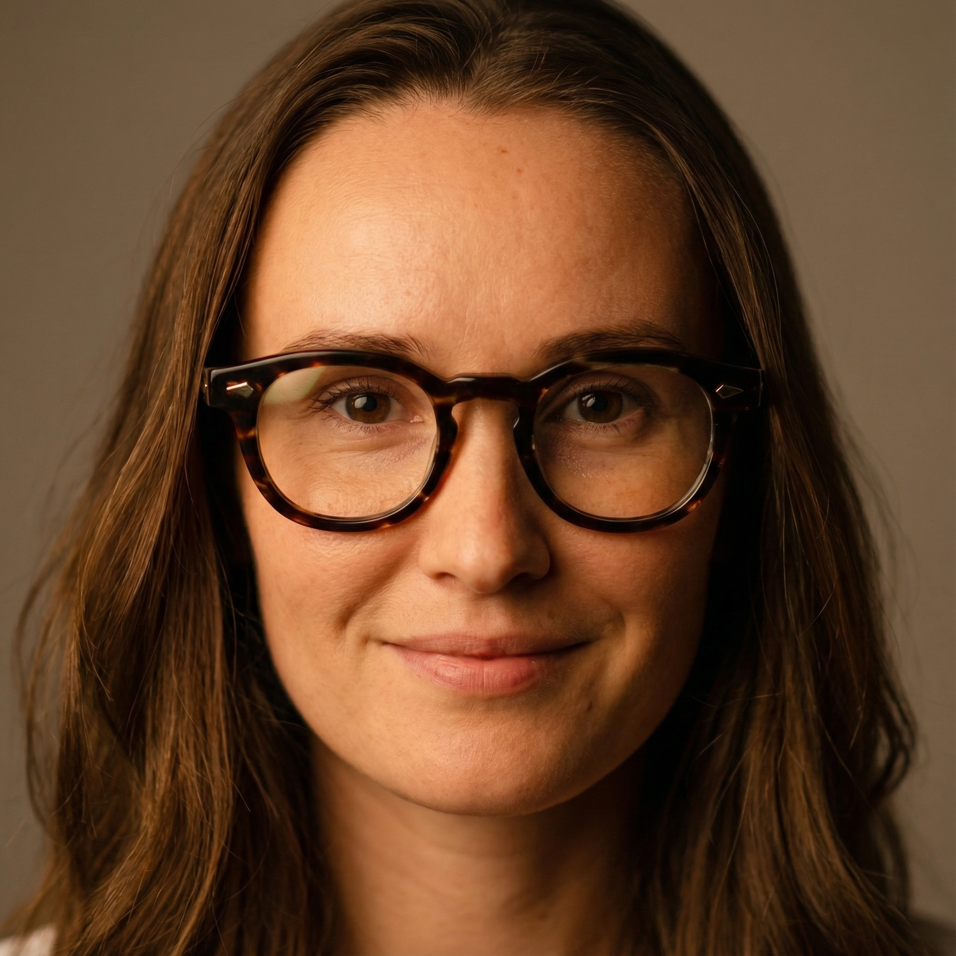 Close-up of a person wearing gold-rimmed glasses on a plain background